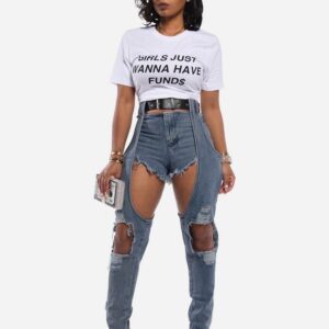 • Fashion Light Blue Ripped Denim Jeans Women