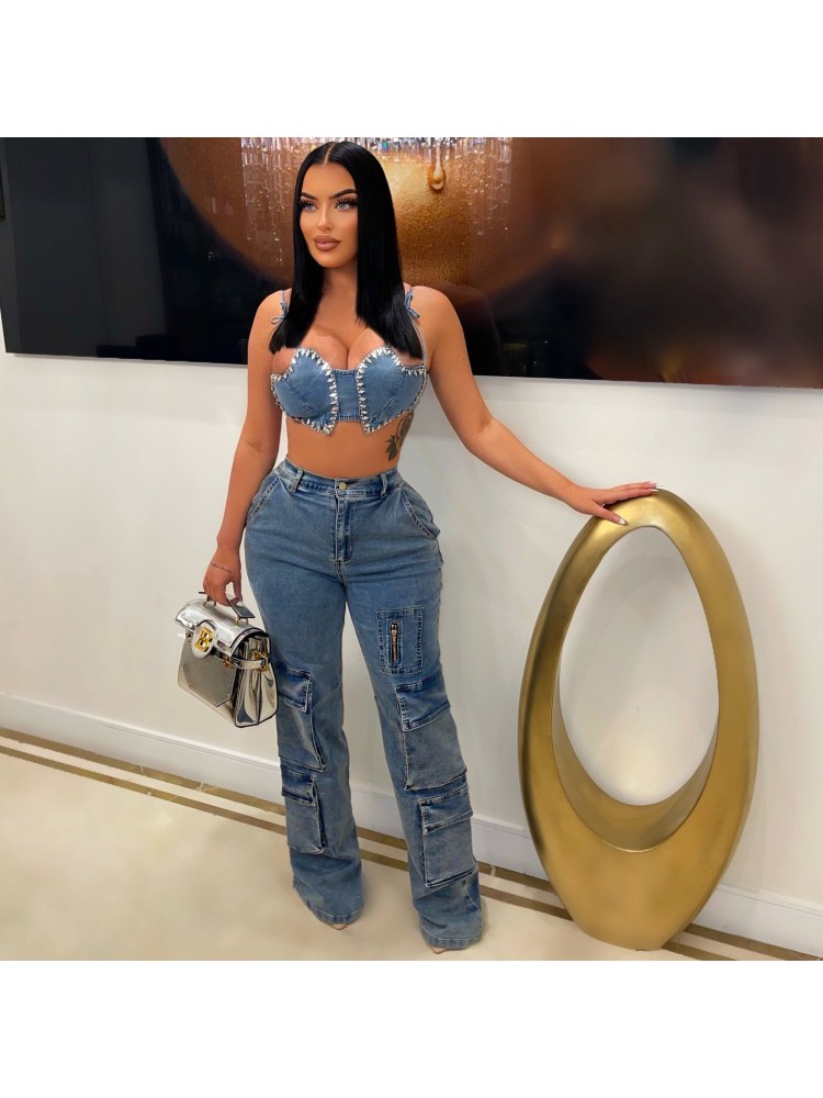 • Designer High Waist Blue Straight Cargo Jeans For Women