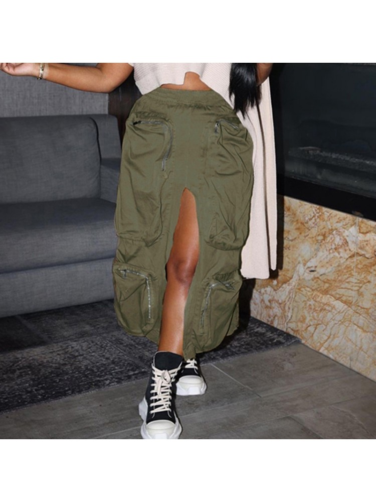 HomeBOTTOMDesigner Zip Pockets Elastic Waist Loose Cargo Midi Skirts