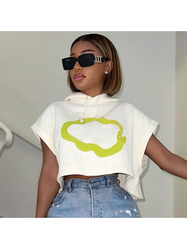HomeTOPWomen White Loose Graphic Hooded Collar Cropped Tops